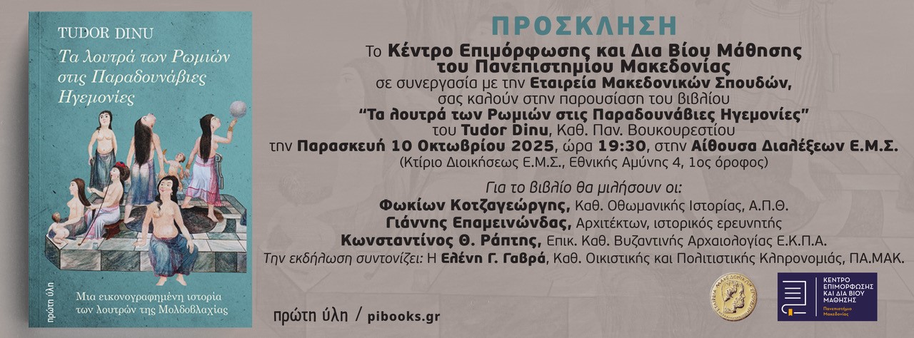 Το Κέντρο Επιμόρφωσης και Δια Βίου Μάθησης του Πανεπιστημίου Μακεδονίας σε συνεργασία με την Εταιρεία Μακεδονικών Σπουδών, σας καλούν στην παρουσίαση του βιβλίου “Τα λουτρά των Ρωμιών στις Παραδουνάβιες Ηγεμονίες” του Tudor Dinu, Καθ. του Πανεπιστημίου Βουκουρεστίου, την Παρασκευή 10 Οκτωβρίου 2025, ώρα 19:30 στην Αίθουσα Διαλέξεων της Ε.Μ.Σ. (Κτίριο Διοικήσεως ΕΜΣ, Εθνικής Αμύνης 4, 1ος όροφος)